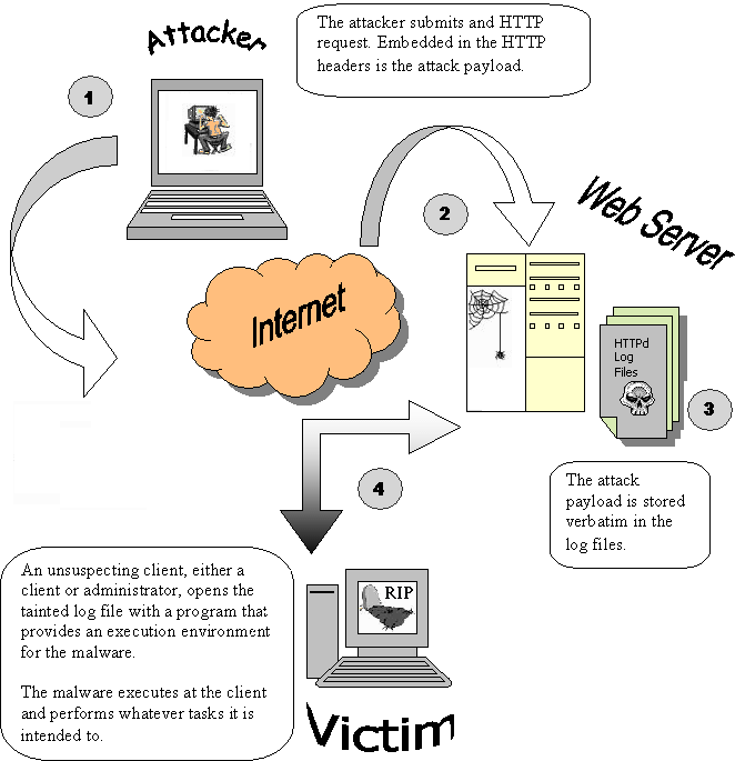 In BugTraq 3939 (10 Bugtraq), the W3Perl (12 W3Perl) program illustrates HTTP header exploitation as discussed by Zenomorph. In this example, the W3Perl program allows unsanitized client input to be recorded in its log files. These log files are then used to produce statistics reports on website usage, and allowed injection via HTTP header values due to inadequate input data validation.