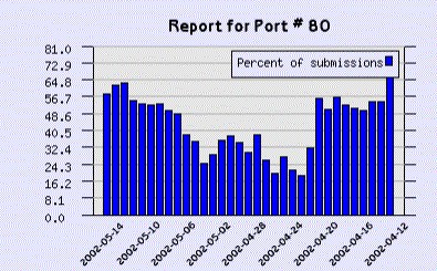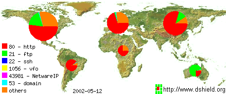 The illustrations below are examples of the frequent and pervasiveness of TCP port 80 probes and attacks. In this illustration I find the global distribution of TCP port 80 probes particularly interesting because it indicates the degree this thread has saturated the Internet.