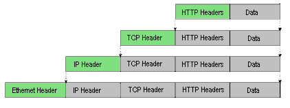 Using the example of an HTTP client request, lets take a look at encapsulation. If you look at the figure to the left, from top to bottom, the one point to notice is that as an HTTP request passes from the click of the client's mouse down to their network wire, each layer of the networking protocol takes the previous layer and encapsulates, or bundles up, that entire package into a payload to be packed into the cargo-bay. The next layer will preform the same process until the physical layer protocol takes the package, now encapsulated repeatedly, at least once at each layer, and moves it across the physical wire.
